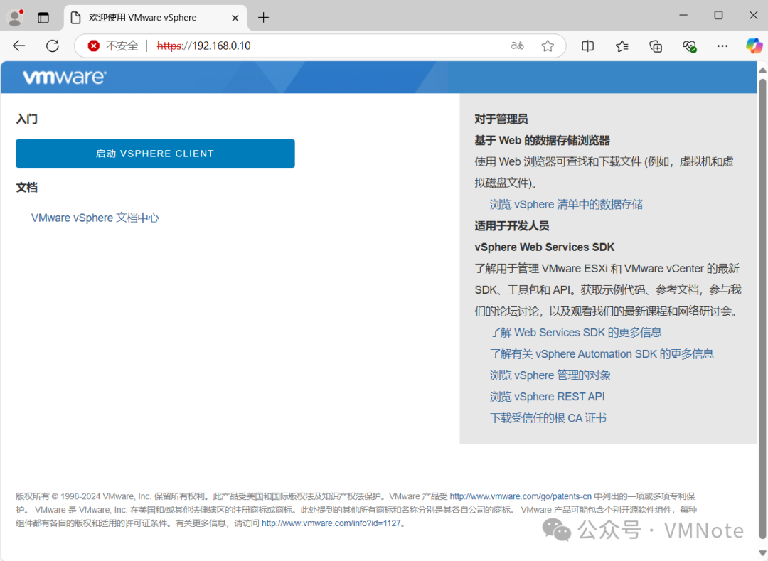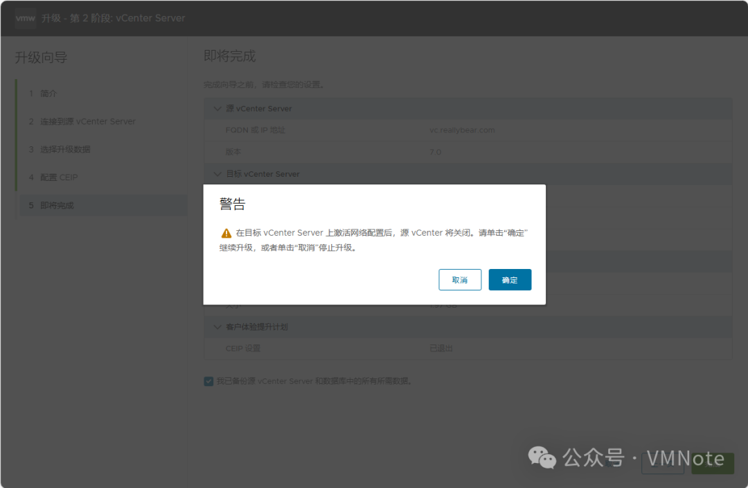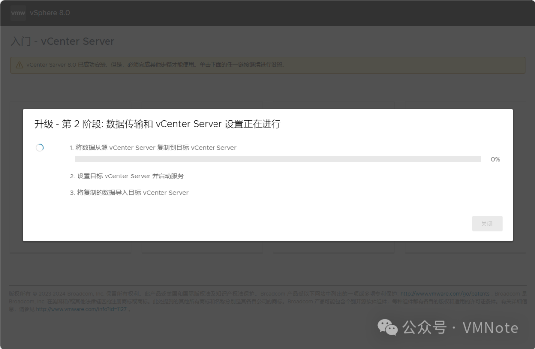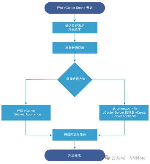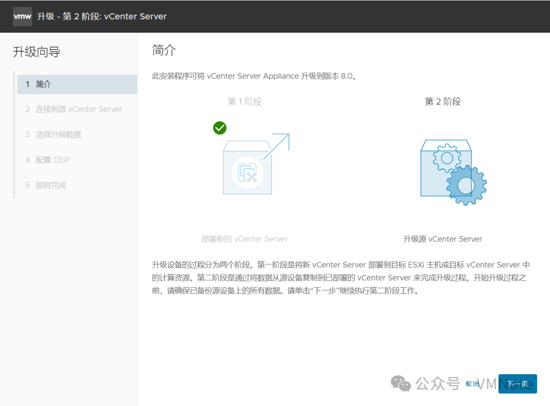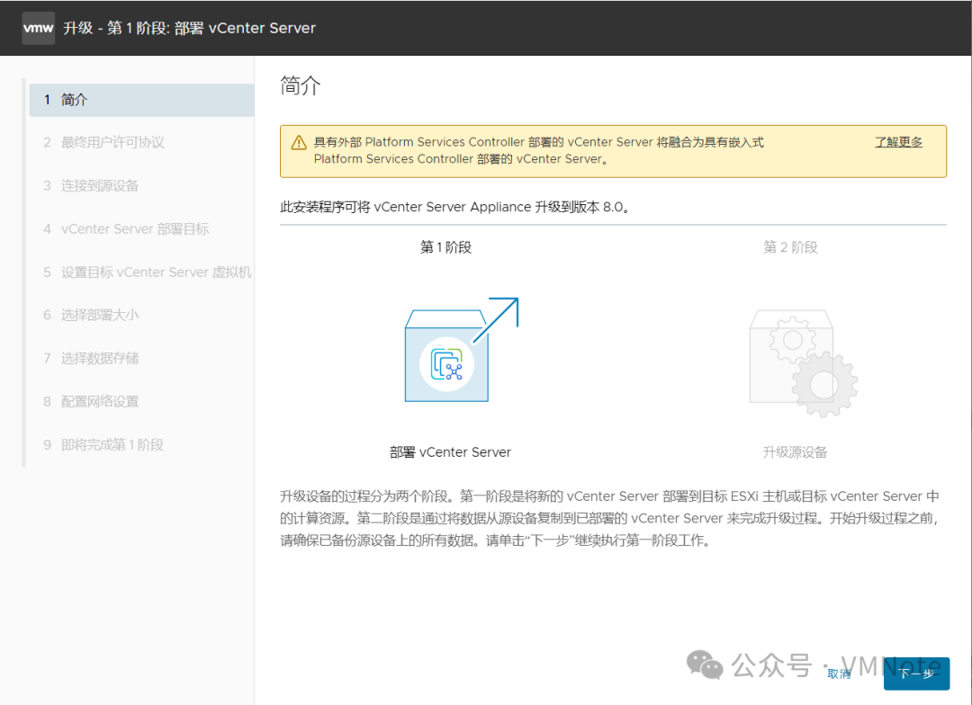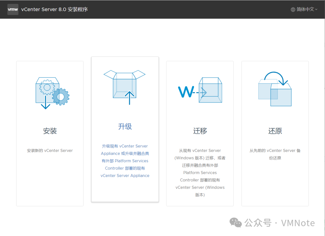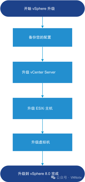 注意:如果现有环境的vCenter Server 是6.5或更早版本的版本,那么必须先升级到6.7或7.0版后,才能升级到8.0的版本。详见 VMware 手册说明:要升级 vCenter Server Appliance 版本 6.5 或更早版本,必须先升级到版本 6.7 或 7.0,然后再升级到版本 8.0。有关将 vCenter Server Appliance 6.5 升级到版本 6.7 的信息,请参见《VMware vSphere》6.7文档。有关将 vCenter Server Appliance 6.5 升级到版本 7.0 的信息,请参见《VMware vSphere》7.0文档。有关 vCenter Server 升级兼容性的信息,请参见《VMware 兼容性指南》
