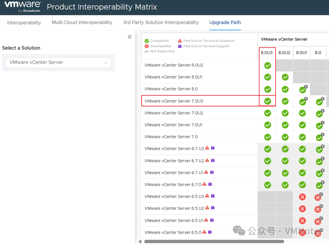 第1步,访问 VMware 产品互操作性网站,在升级路径(Upgrade Path)选项卡中,确认vCenter Server可以从7.0U3的版本升级到8.0U3的版本。(https://sim.esp.spespg1.vmw.saas.broadcom.com/Upgrade?productId=2)