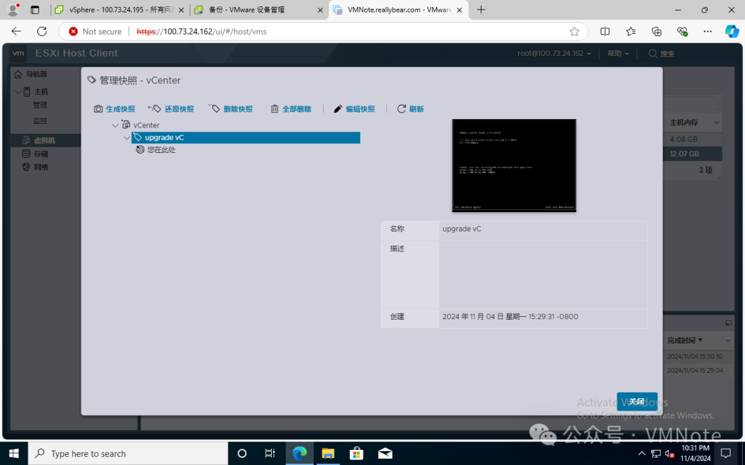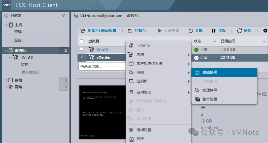 第5步,访问现有 vCenter Server 7 所在ESXi主机的客户端(Host Client),对 vCenter Server 7 这台虚拟机做快照