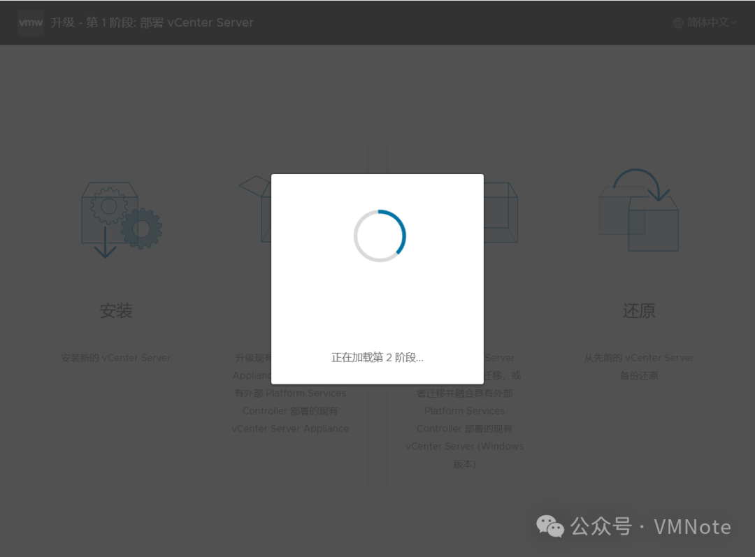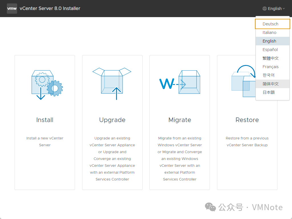 第3步,在弹出的vCenter Server安装向导页面,默认显示的是英文,点击右上角的下拉菜单将其改为简体中文