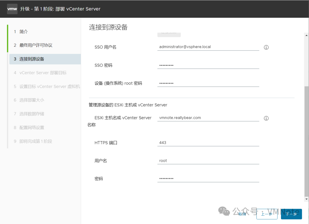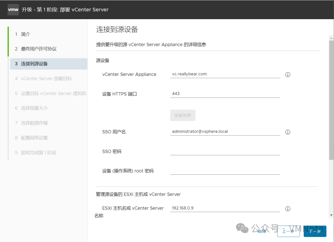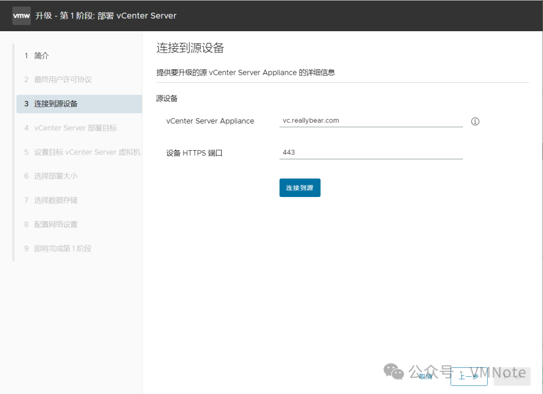 第7步,在 连接到源设备 页面,输入现有vCenter Server 7的域名(FQDN),然后点击 连接到源