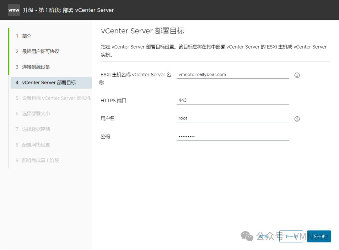 第8步,在 vCenter Server部署目标 页面,输入ESXi主机的域名和账户密码