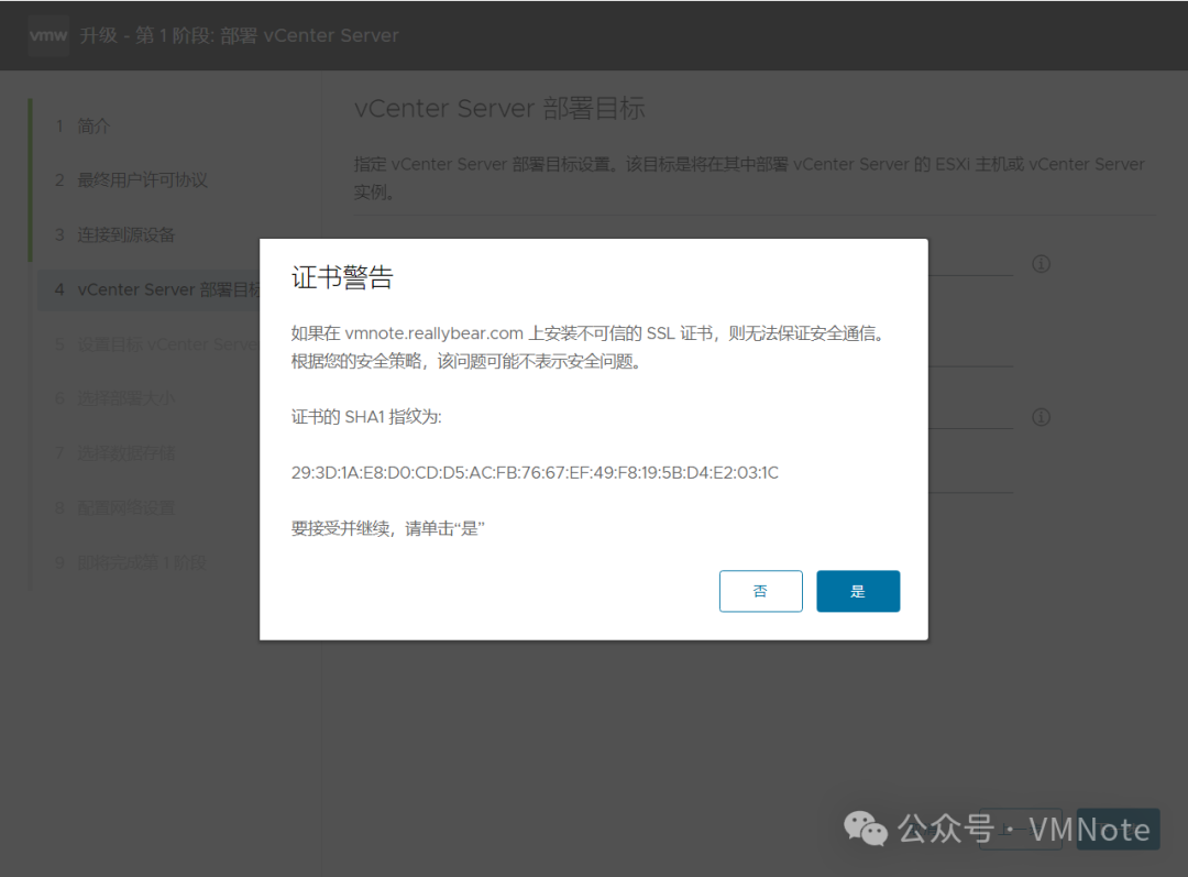 第9步,在弹出的ESXi SSL证书警告页面,点击 是 按钮