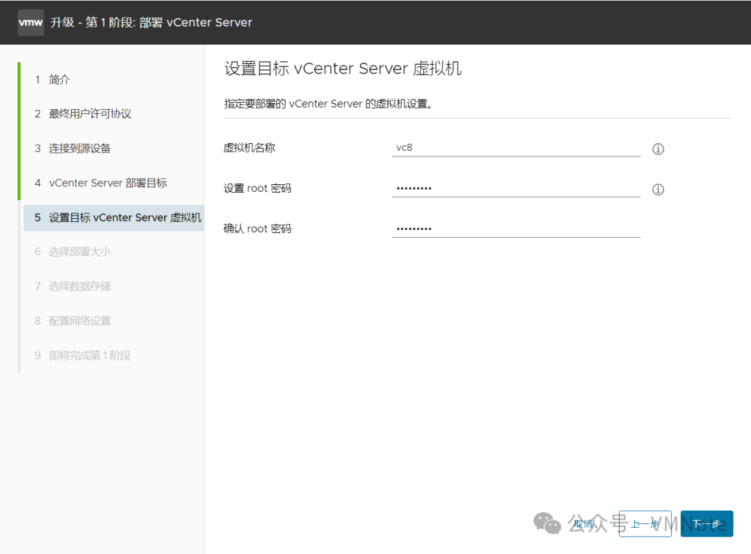 第10步,在 设置vCenter Server虚拟机 页面,配置 vCenter Server 8 虚拟机的名称及root账户的密码,然后点击 下一步注:密码要求相对比较高,需要8~20个字符,要求包含4种字符(大小写字母,数字,特殊字符),推荐设置和旧的vCenter Server一样,避免太多密码记乱了。