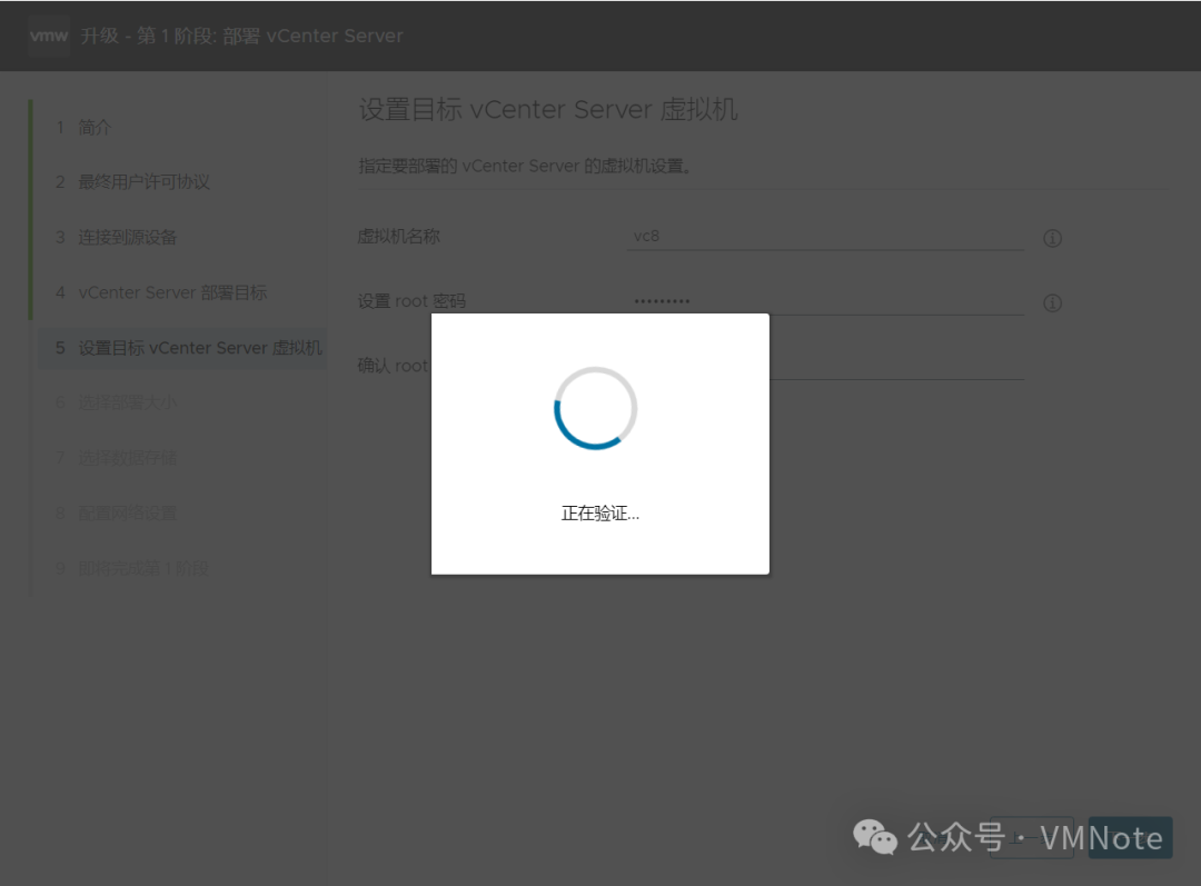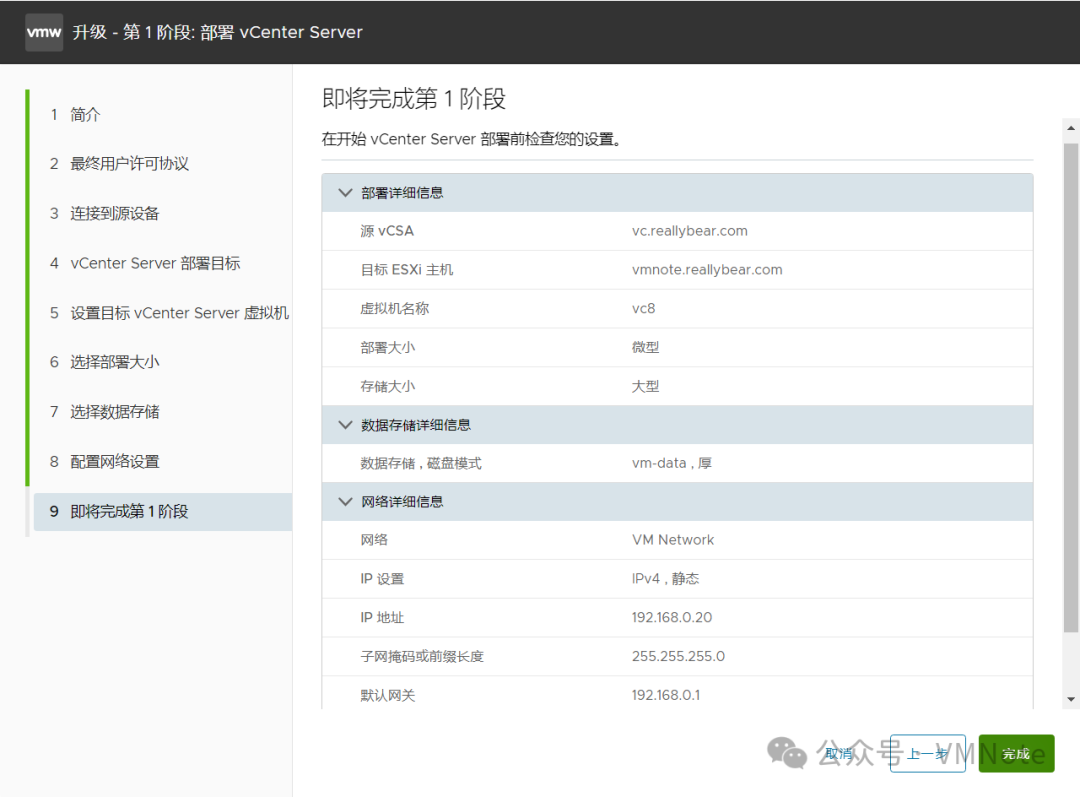 注:第一阶段的部署的是将个人电脑上的vCenter Server Applicance 的OVA文件推送到ESXi主机上,因此部署时间长短取决于ESXi主机的性能以及网络的速度。