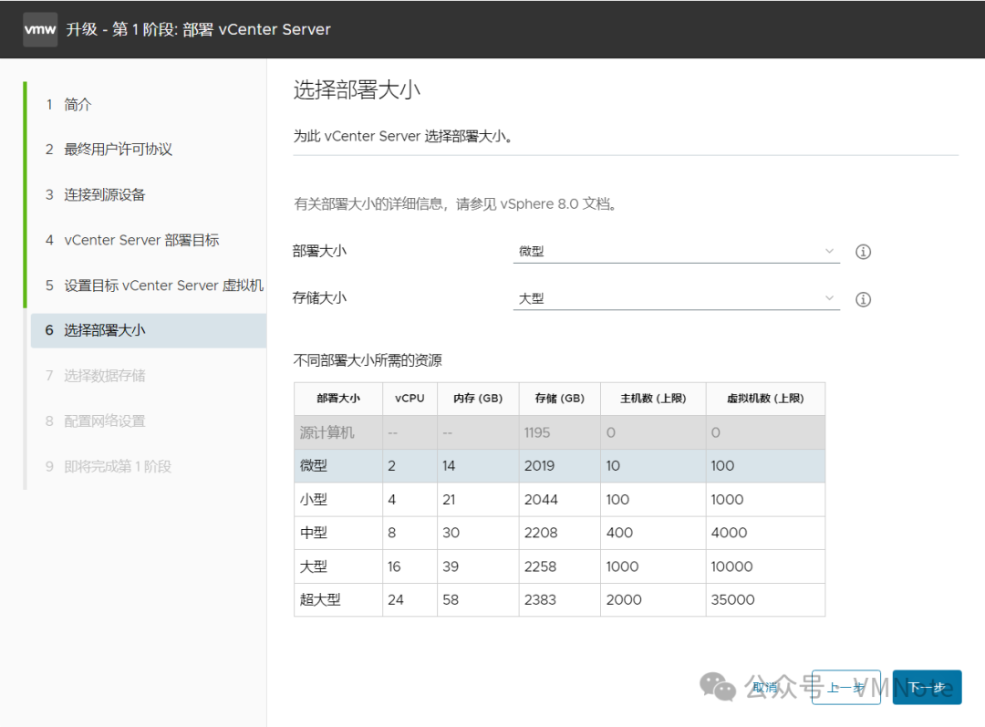 第11步,在 选择部署大小 页面,根据实际情况选择vCenter Server 的部署规模并点击下一步
