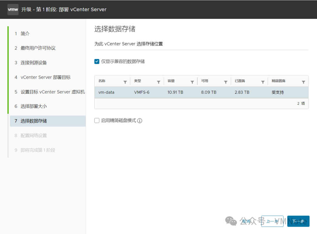 第12步,在 选择数据存储 页面上,选择需要将vCenter Server放置的存储位置,并点击下一步