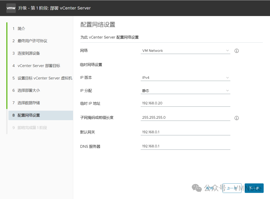 第6步,准备一个与现有 vCenter Server 7 同网段且未使用的临时IP地址,以便用来部署vCenter Server 8的虚拟机。