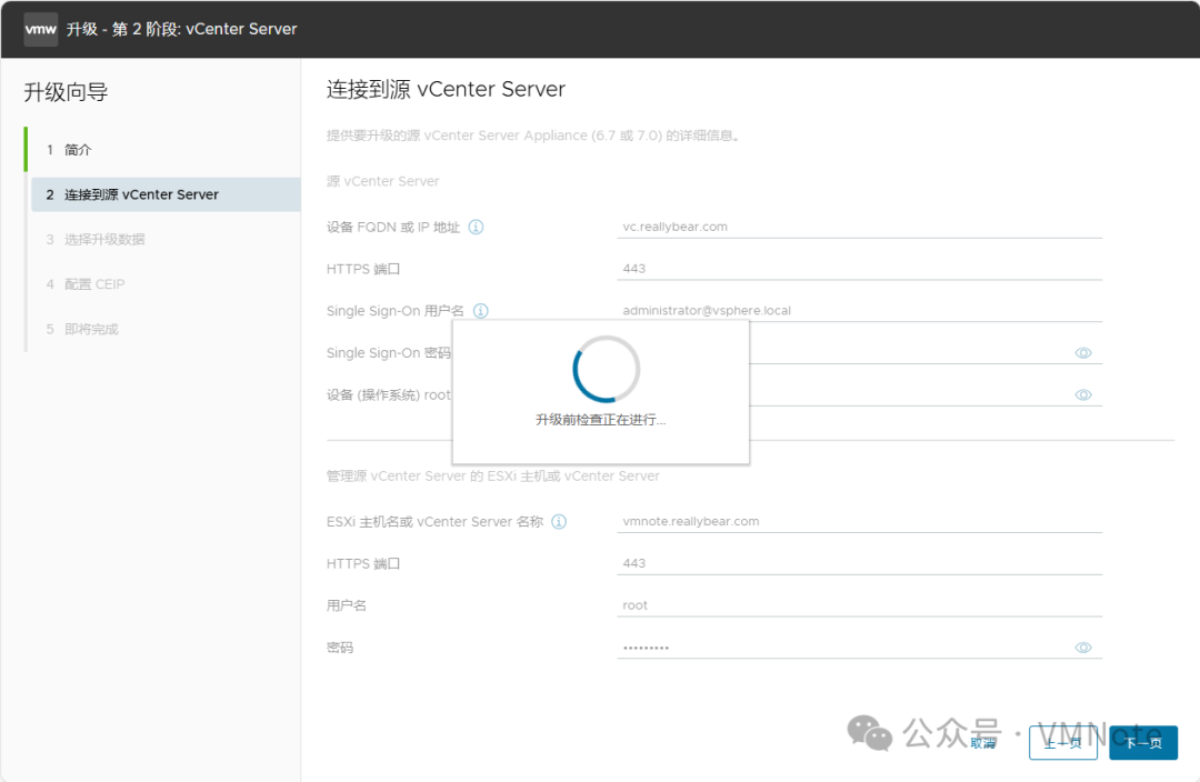 第2步,在 链接到源vCenter Server 页面,根据提示输入旧vCenter Server 7 的域名、管理员账户密码以及旧vCenter 所在的ESXi主机的域名、管理员账户密码后,安装程序将在旧vCenter Server 上运行升级前检查