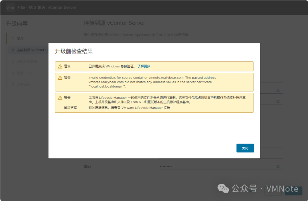 1. 在第2阶段的第2步连接到源vCenter Server 失败,提示“升级前检查失败,原因是出现以下问题:Error in method inbocation[Error 1] unkown host”