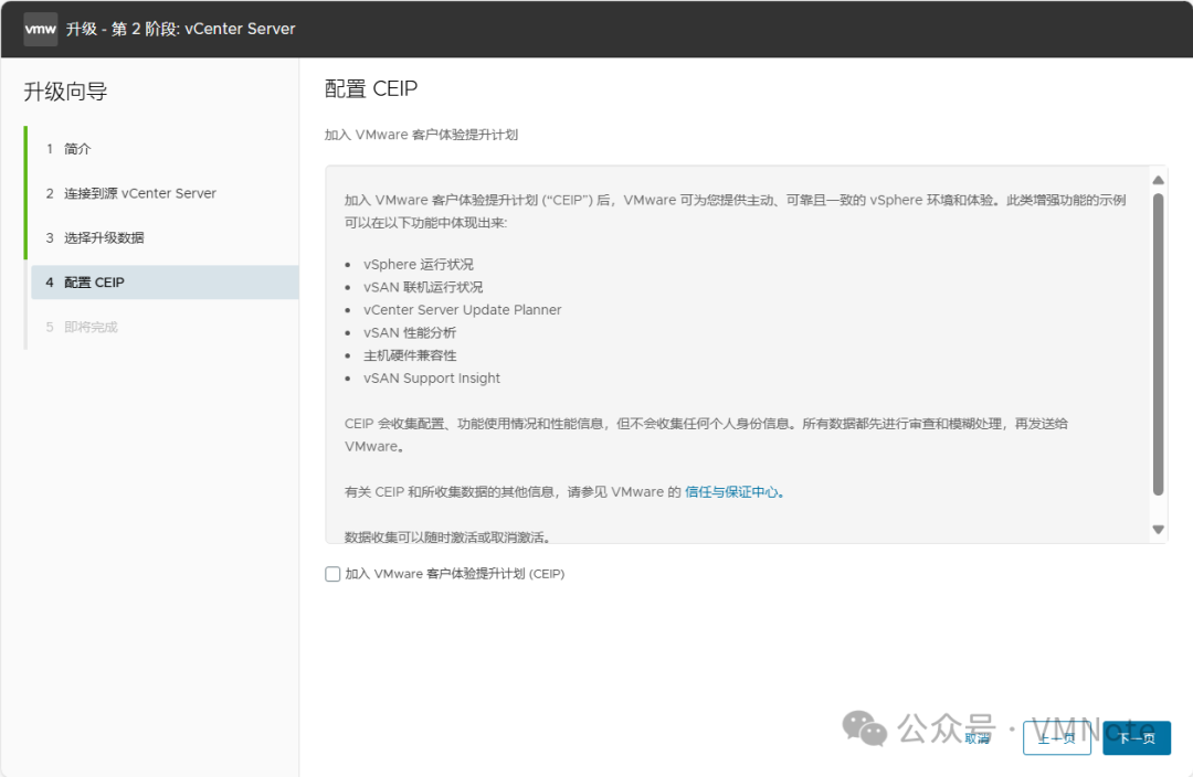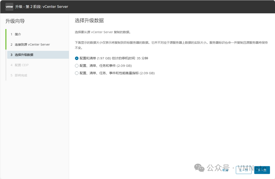 第4步,在 选择升级数据 页面,选择要将旧vCenter Server 7上的哪些数据导入到新vCenter Server 8 中