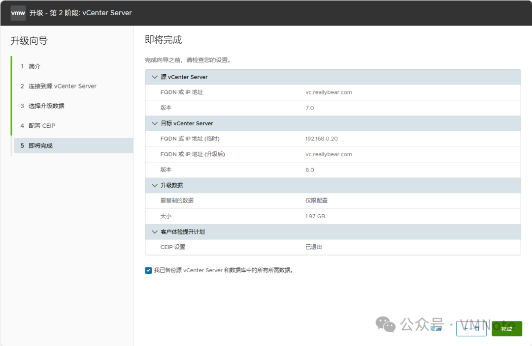 vCenter Server Appliance 的升级是从旧版本迁移到新版本的过程,包括部署一台8.0版的新vCenter Server Appliance ,并为其分配一个临时 IP 地址,以便将配置和服务数据从旧vCenter Server 迁移到新vCenter Server上。完成迁移之后,旧vCenter Server的IP地址和主机名将应用于新vCenter Server上。升级结束时,会释放临时 IP 地址并关闭旧vCenter Server。