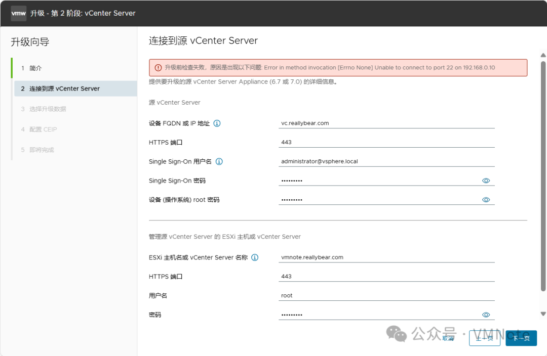 解决方案:将旧vCenter 分配域名并创建好IP和域名的正反解析后问题解决。2. 在第2阶段的第2步连接到源vCenter Server 失败,提示“升级前检查失败,原因是出现以下问题:Error in method inbocation[Error none] unable to connect to port 22 on 192.168.0.10”