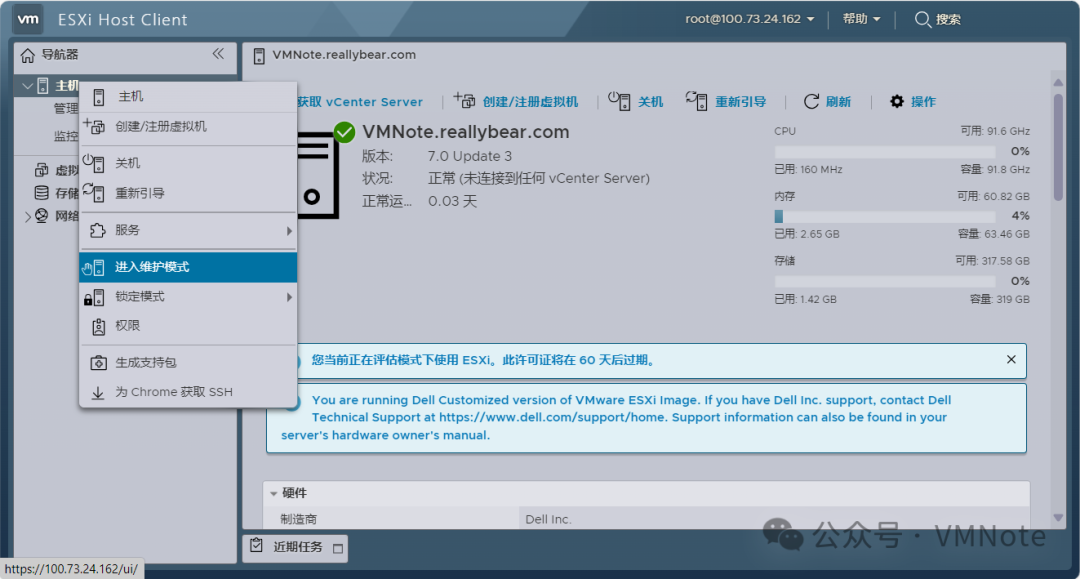 第1步,将ESXi主机进入维护模式,具体步骤参考:《如何将ESXi主机置于或退出维护模式?》