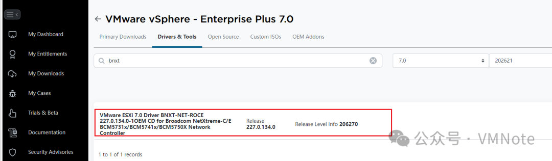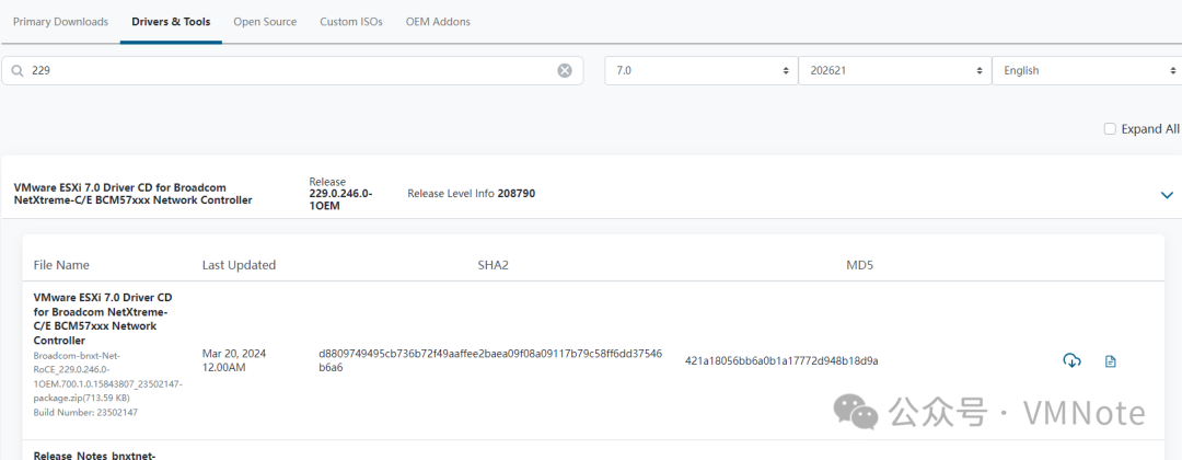 总结:在博通支持主页下载驱动,如果根据驱动的名称搜索不到,可以尝试用驱动的版本号搜索。关于下载VMware驱动的详细步骤请参考:《如何从博通支持主页下载VMware vSphere ESXi的驱动包》