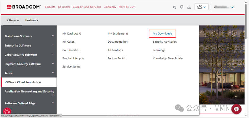 第2步,点击 Products —> Software —> VMware Cloud Foundation —> My Downloads