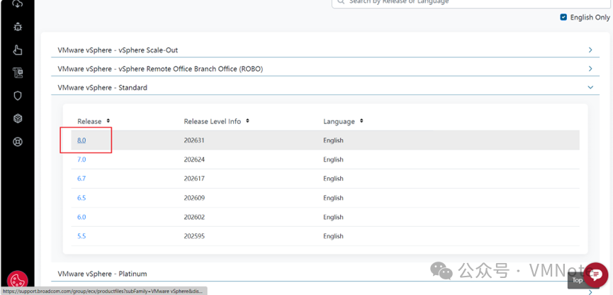 第4步,在VMware vSphere产品页面,选择vSphere的版本类型,然后点击右边的箭头,然后点击对应的版本