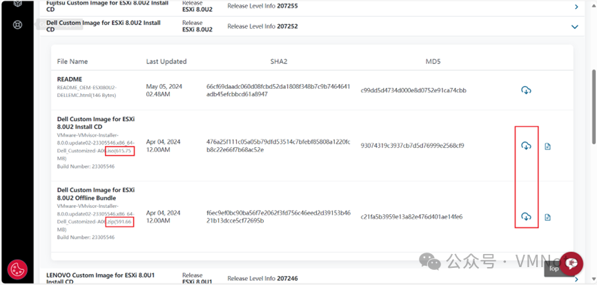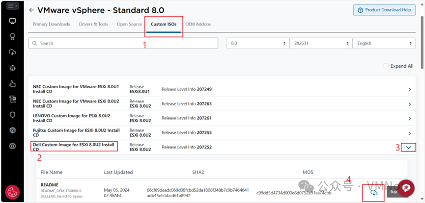 第5步,在vSphere 版本下载页面,选择 Custom ISOs ,然后找到OEM厂商的名字(比如“Dell”) 开头的列,然后点击右边的箭头