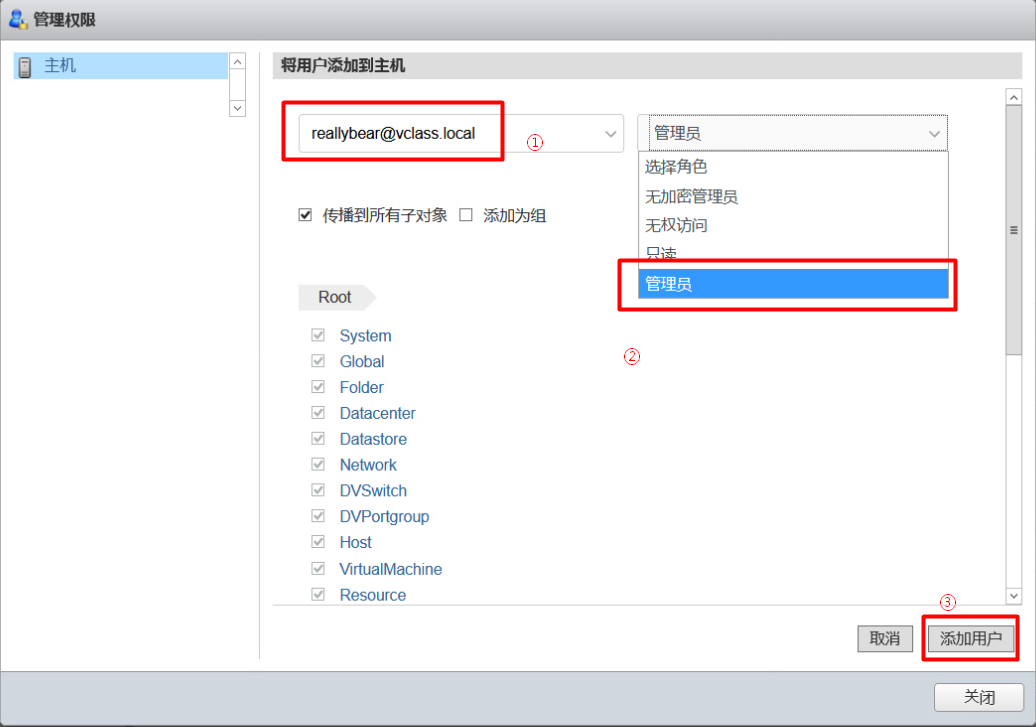 第6步,在将用户添加到主机的页面,输入刚创建的域用户名,并选择赋予的角色,然后点击“添加用户”