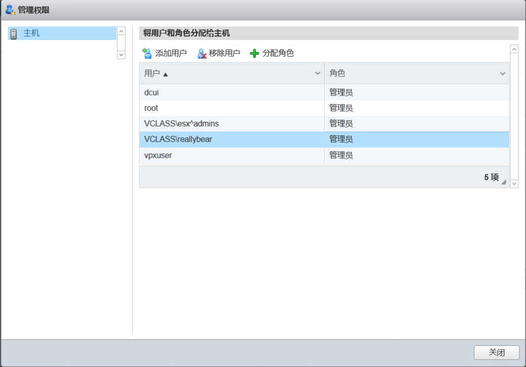 第7步,在管理权限页面确认用户和角色添加成功后,点击“关闭”