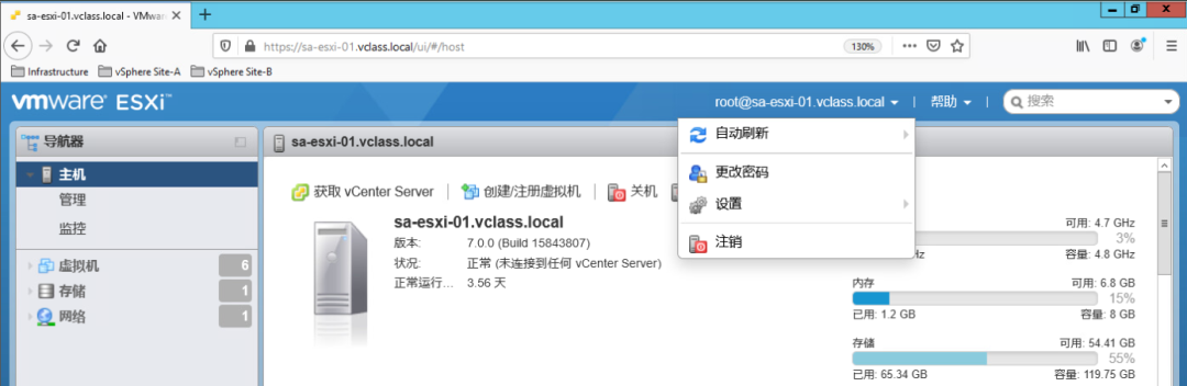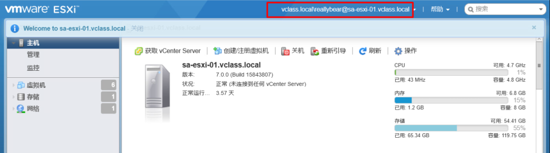 第3步,使用ESXi的root账户登录ESXi主机客户端(Host Client)