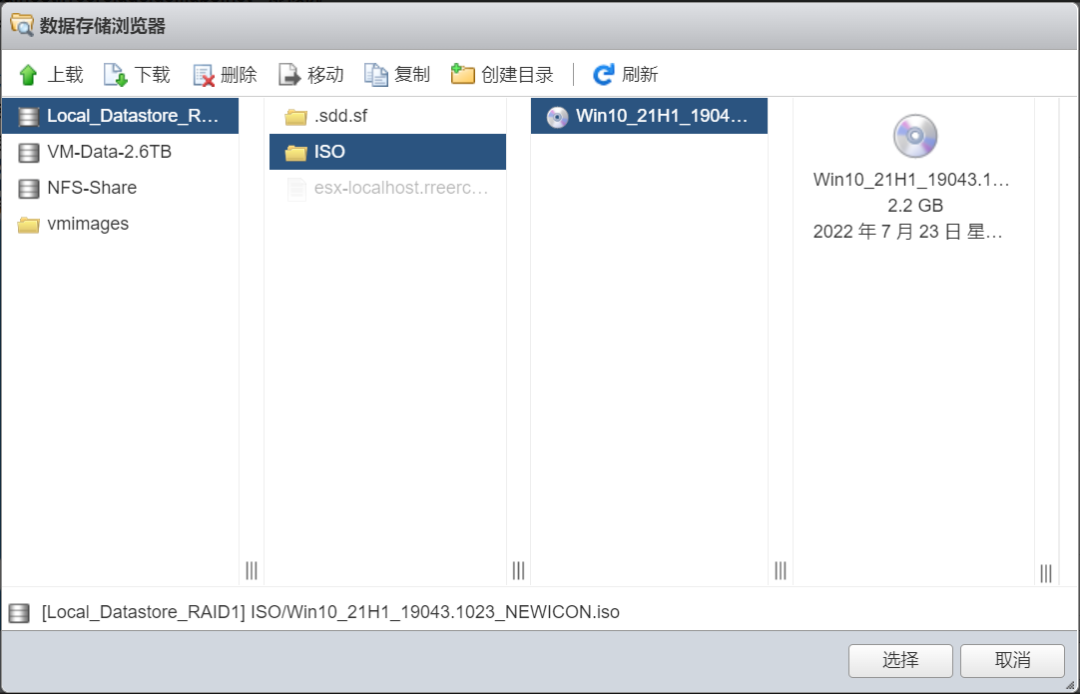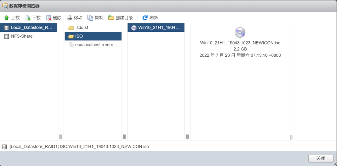 第2步,将操作系统安装包的ISO文件上传到数据存储中,具体步骤参考:《 如何上传文件到VMware ESXi的数据存储(Datastore)》