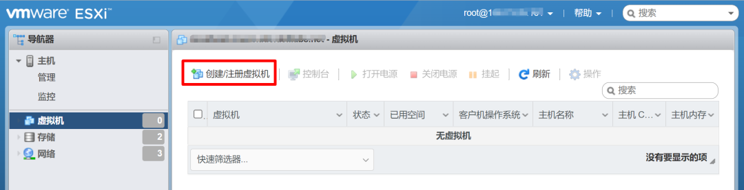 第3步,在ESXi主机客户端界面,选择 虚拟机 -> 创建/注册虚拟机,将弹出新建虚拟机的向导