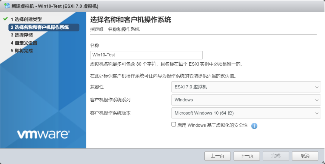 第5步,在 选择名称和客户机操作系统 页面,输入虚拟机的名称以及虚拟机的兼容性、操作系统的详细版本等信息,然后点击 下一页