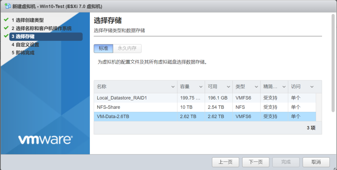 第6步,在 选择存储 页面,选择虚拟机存放位置的数据存储(datastore),然后点击 下一页