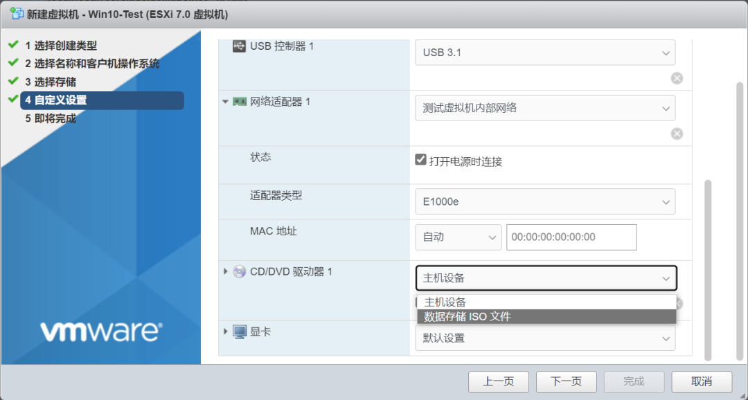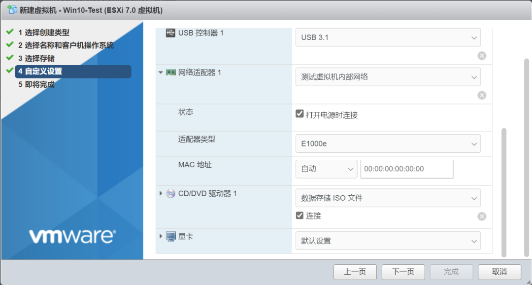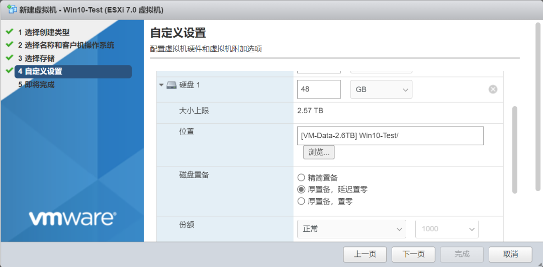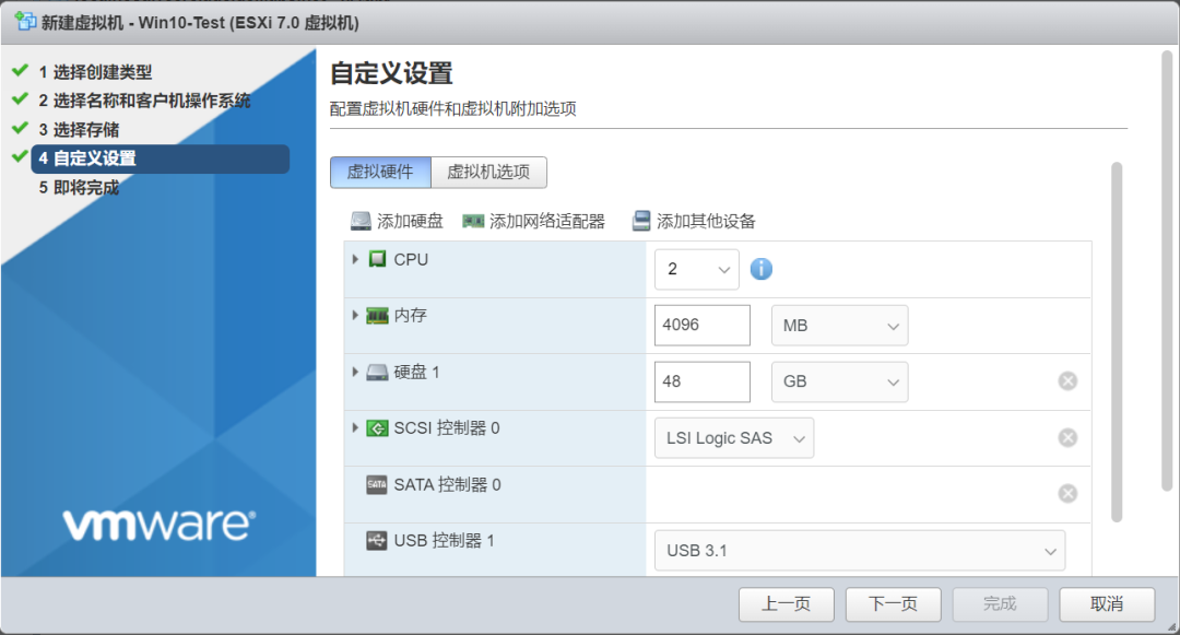 第7步,在 自定义设置 页面,配置虚拟机的虚拟硬件和虚拟机附加选项