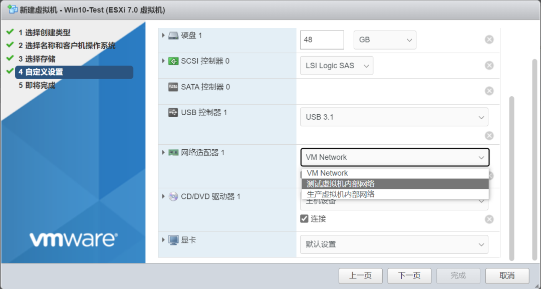 第9步,在 网络适配器 部分,选择虚拟机要接入的网络(虚拟机端口组),关于虚拟机端口组的创建,参见:《如何给VMware ESXi主机创建标准虚拟交换机》
