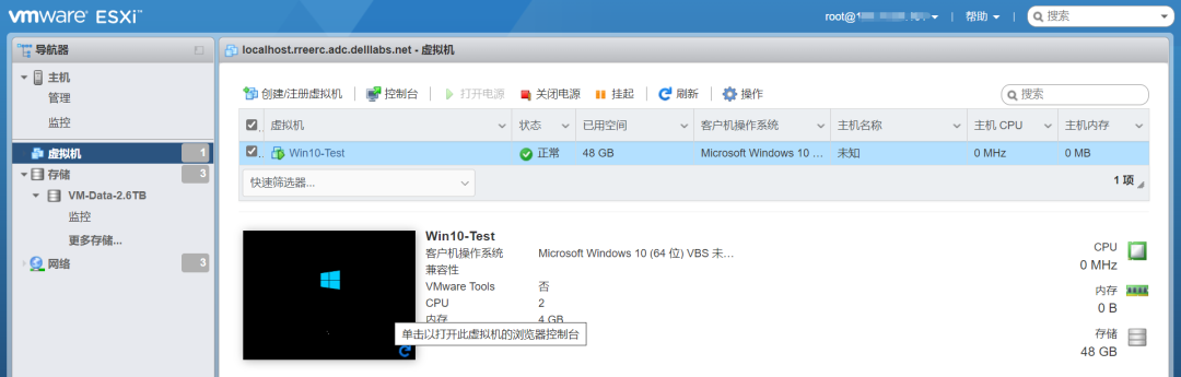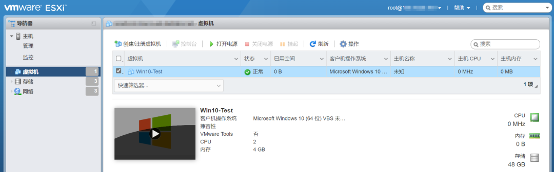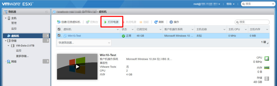 第1步,在ESXi主机客户端界面,选择 虚拟机,选择刚创建的虚拟机,点击 打开电源