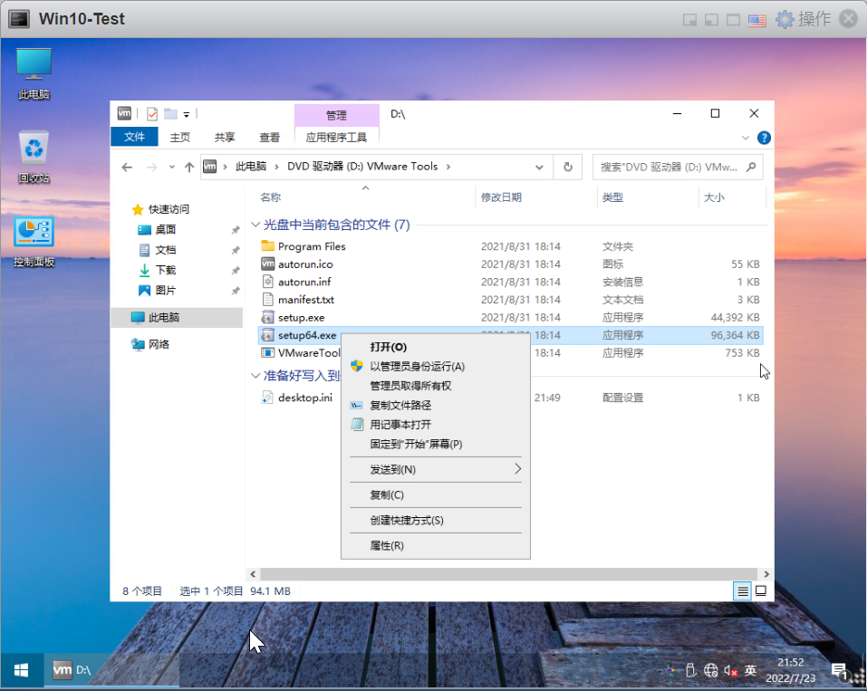 第2步,打开虚拟机窗口的虚拟机桌面上,选择 我的电脑 -> VMware Tools 安装盘