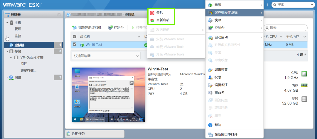关机(Shutdown Guest):ESXi通过VMware Tools给虚拟机操作系统发送执行关机的命令
