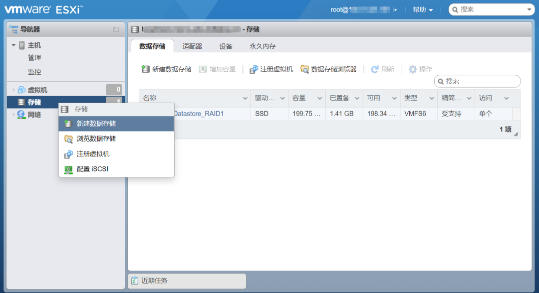 第2步,在ESXi主机客户端界面,选择 存储 -> 新建数据存储。