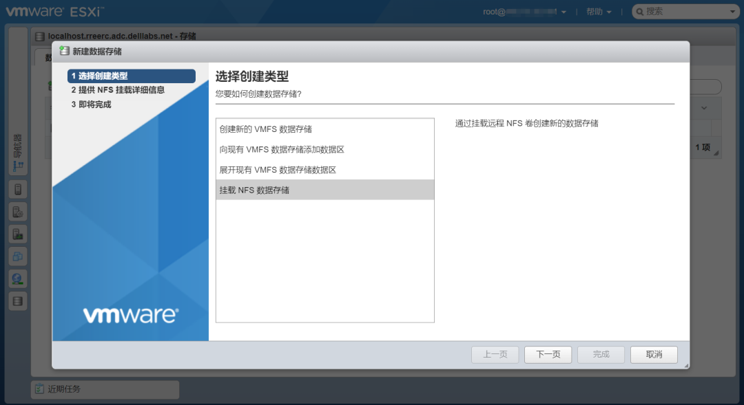 第3步,在弹出的 选择创建类型 页面,选择 挂载NFS 数据存储 ,然后点击 下一页