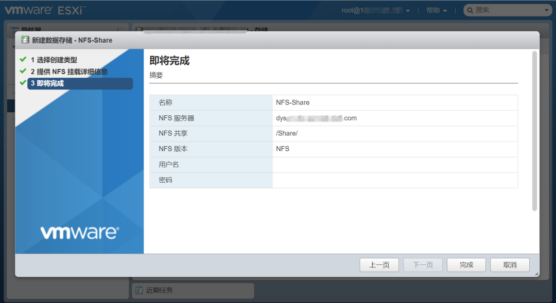 第5步,在 即将完成 页面,确认填写的NFS配置信息无误后,点击 完成