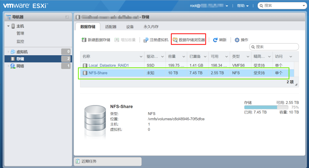 第6步,在ESXi主机客户端界面,选择 存储 -> 数据存储 ->NFS的数据存储 -> 数据存储浏览器