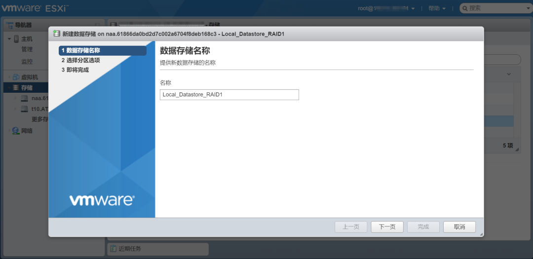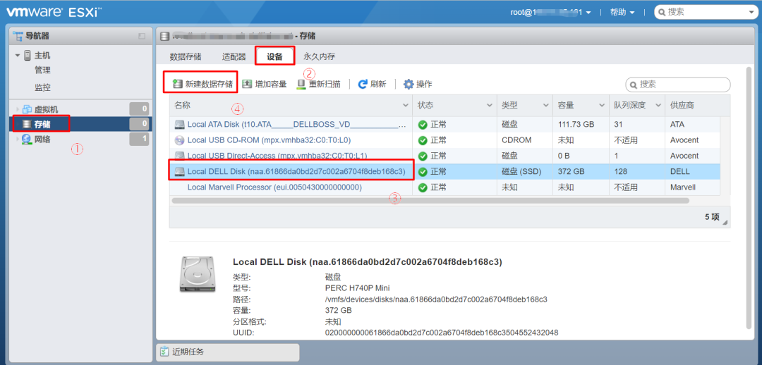 第3步 ,在ESXi主机客户端界面,点击 存储 -> 设备,确认有识别到新建RAID的磁盘,然后点击 新建数据存储