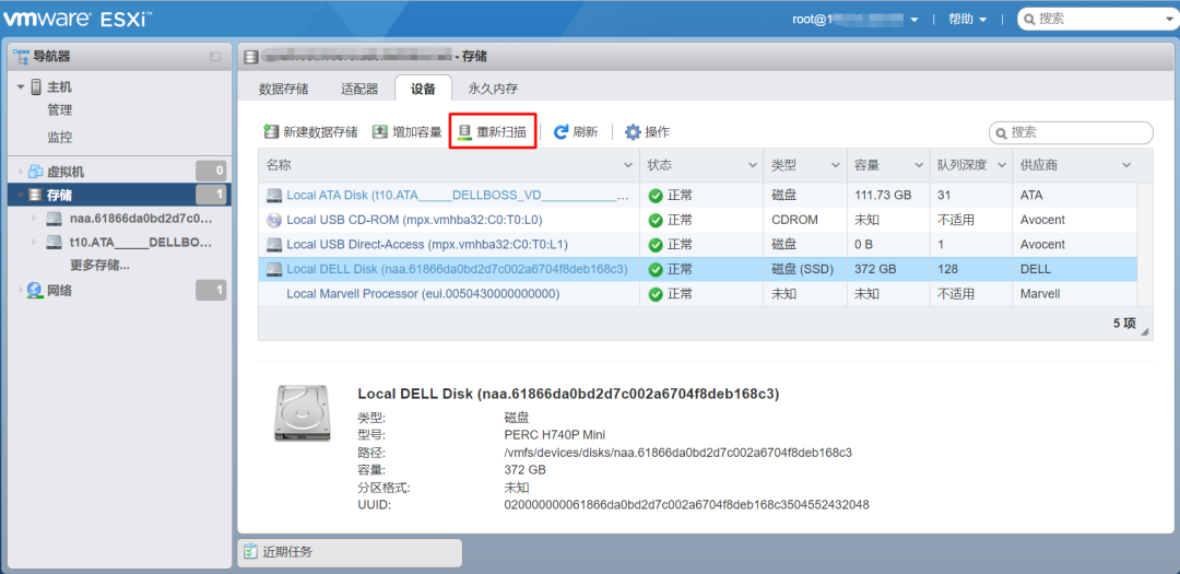 第8步,在ESXi主机客户端界面,点击 存储 -> 设备 -> 重新扫描