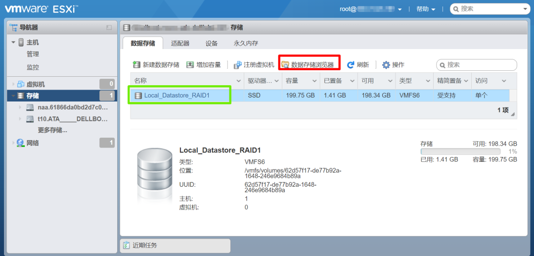 第9步,在ESXi主机客户端界面,点击 存储 -> 数据存储 ,确认数据存储创建成功,然后点击 数据存储浏览器
