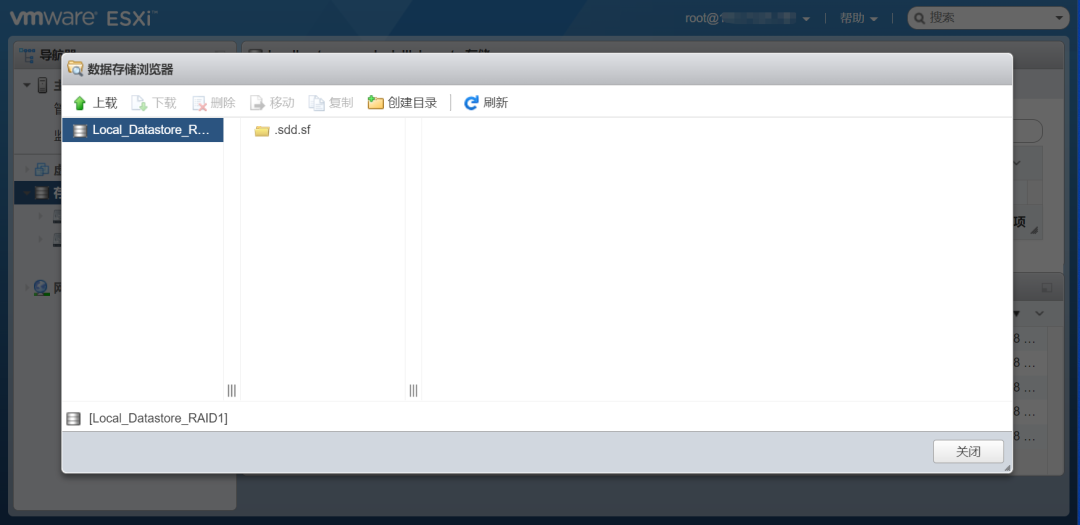 第10步,在数据存储浏览器页面,可以创建目录、上传文件,当然新建的虚拟机文件也可以保存到这个数据存储中