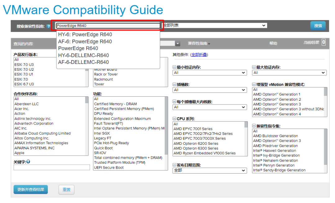 在兼容性指南的主页,输入服务器的名称:比如Poweredge R640 ,然后点击右边的 搜索 按钮