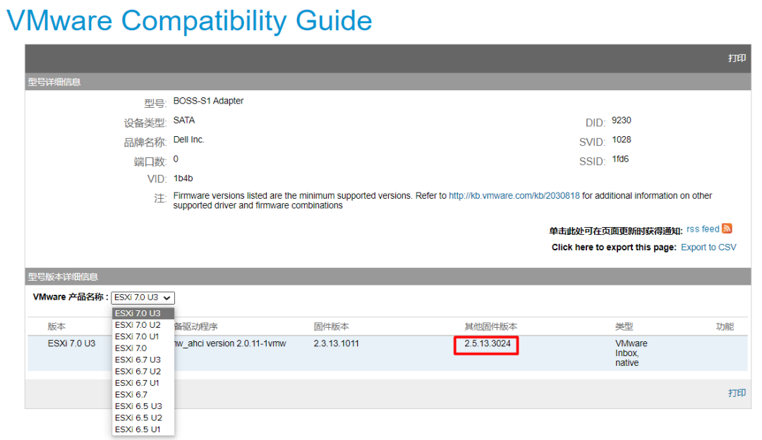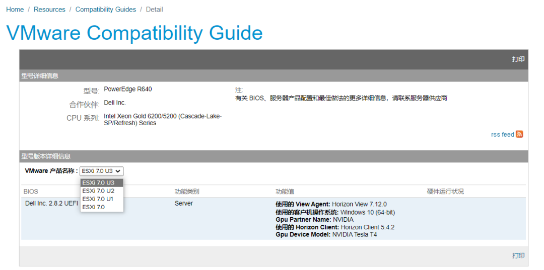 在VMware 产品名称列表里面,选择下拉框可以看到这个CPU型号的R640支持的VMware ESXi版本,以及对应的BIOS要求
