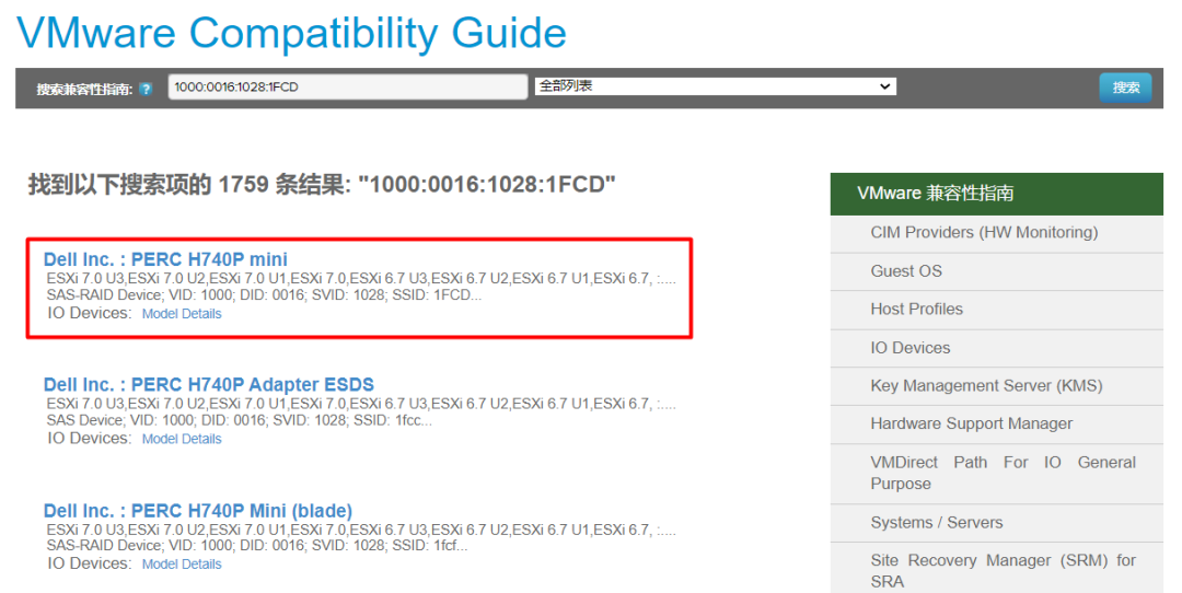 在兼容性指南的主页,输入控制器的型号或者PCIE ID号:比如 :PERC H740P Mini所对应的PCIE ID:1000:0016:1028:1FCD,然后再点击右边的 搜索 按钮