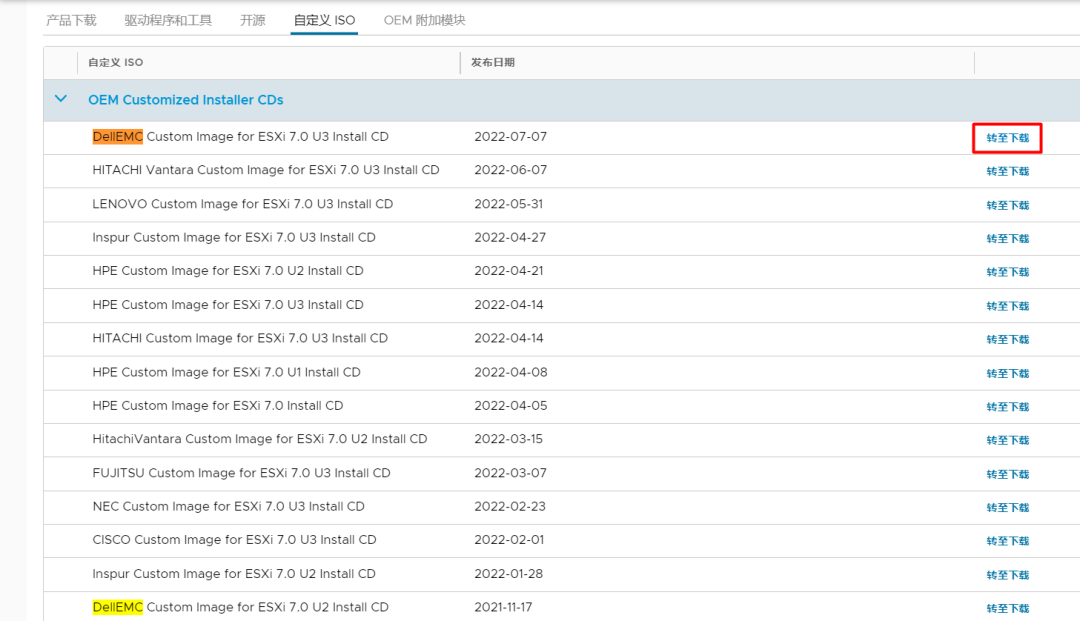 第6步,在 自定义ISO页面中,搜索服务器产商的名字,比如DELLEMC,然后点击 转至下载