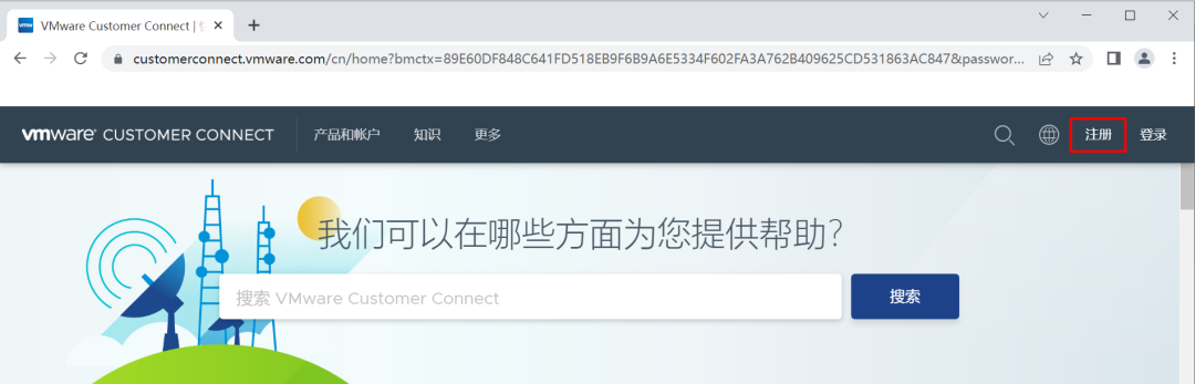 第1步,访问MyVMware 主页(https://my.vmware.com),点击右上角的 注册 按钮