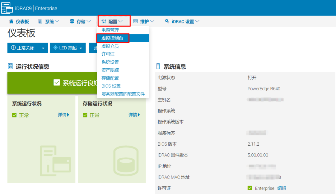 第2步,在iDRAC 页面,选择 配置 -> 虚拟控制台