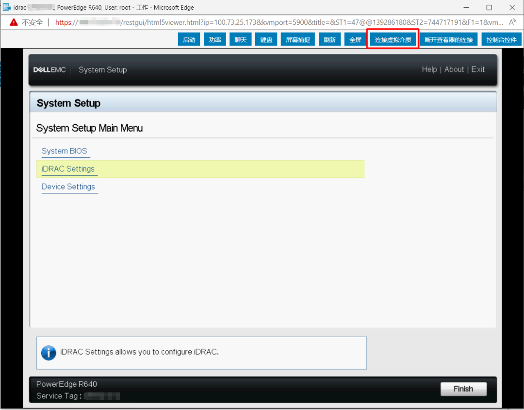 第4步,在弹出的虚拟控制台窗口的控制栏页面,点击 连接虚拟介质 按钮