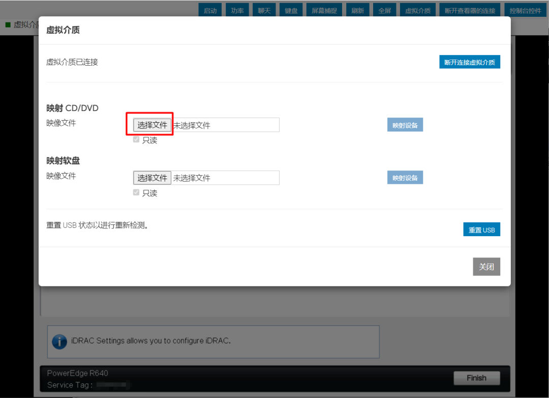 第5步,在虚拟介质页面,点击映射 CD/DVD 映像文件 的 选择文件 按钮